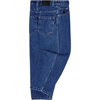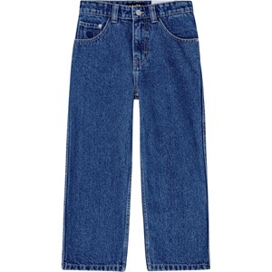 Dark blue oversized jeans with 5 pockets and belt loops. The jeans have an oversized fit and a peace patch by one of the pockets.
