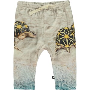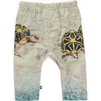 Sabb is a pair of roomy baby trousers with a print of a beach and turtles.