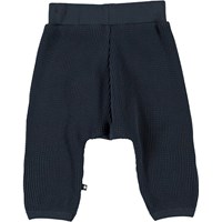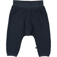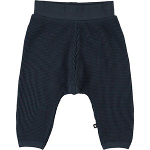 Samantha is a pair of dark blue baby trousers in a waffled organic cotton. They have an elastic waist for a comfortable fit.