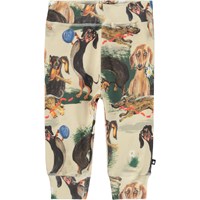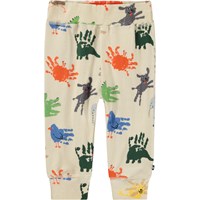 Beige pants for the little ones made of soft organic cotton jersey with a print of colorful handprints that looks like animals. The pants have a wide elastic rib at the waist and ankles to make them comfortable to wear and providing plenty of freedom to move.