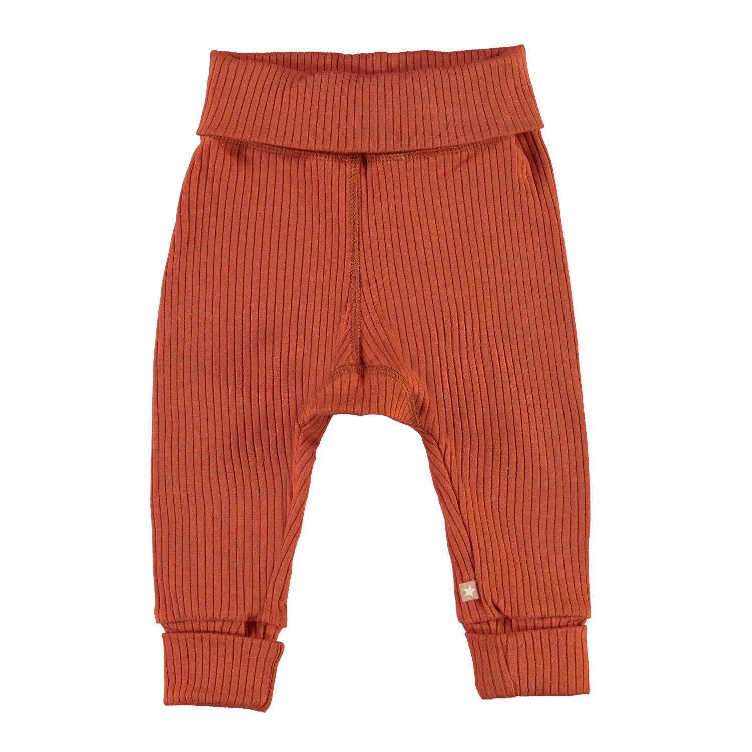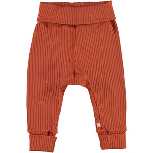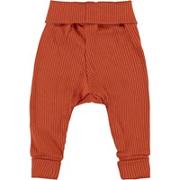 San is a pair of dark red baby trousers in a rib quality. They have wide elastic at the waist and legs. The waist is rolled down and the legs are rolled up. Wear them with a matching top. This Molo product is made of 100% organic cotton.