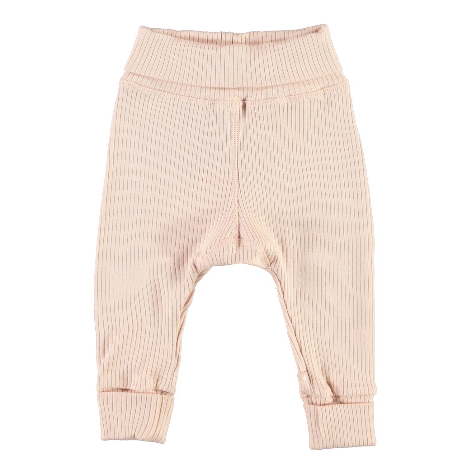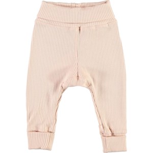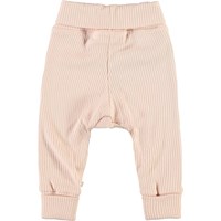 San is a pair of pink baby trousers in a rib quality. They have wide elastic at the waist and legs. The waist is rolled down and the legs are rolled up. Wear them with a matching top. This Molo product is made of 100% organic cotton.