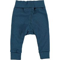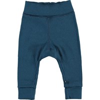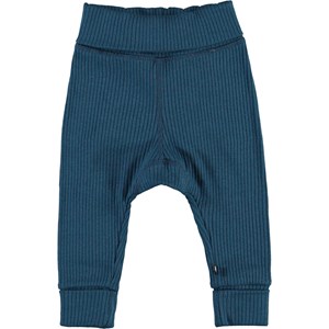 San is a pair of dark blue baby trousers in a rib quality. They have wide elastic at the waist and legs. The waist is rolled down and the legs are rolled up. Wear them with a matching top. This Molo product is made of 100% organic cotton.