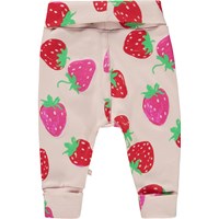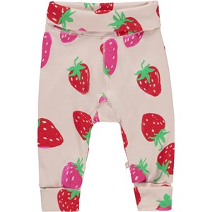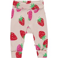 San is a pair of pink baby trousers with a strawberry print. They have wide, rolled elastic at the waist and legs.