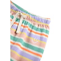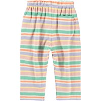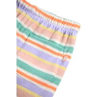 Multicoloured striped pants for the little ones made of organic cotton. The pants have a loose fit with a back pocket and an elastic waistband with a drawstring to make them easy to put on and take off. The light and airy design ensures plenty of space to move and on the pocket you will find a small embroidered smiling face. Combine the pants with the matching sweatshirt for a complete set.