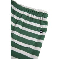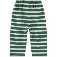 Bretonse green and off-white striped pants for the little ones made of organic cotton. The pants have a loose fit with a back pocket and an elastic waistband with a drawstring to make them easy to put on and take off. The light and airy design ensures plenty of space to move and on the pocket you will find a small embroidered smiling face. Combine the pants with the matching sweatshirt for a complete set.