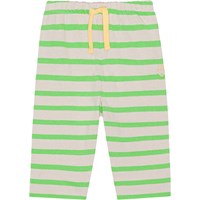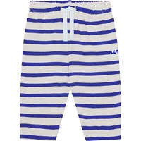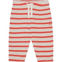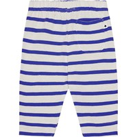 Blue and off-white striped sweatpants for small children in organic cotton. They are in a loose fit and have an elastic waist with a drawstring for a secure, comfortable fit. The sweatpants have a small, light blue smiling face embroidered on the front that matches the drawstring. You can wear purchase this style with a matching top for a complete set.