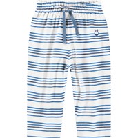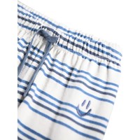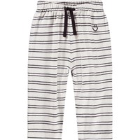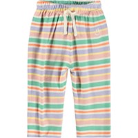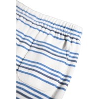 Blue and white striped pants for the little ones made of organic cotton. The pants have a loose fit with a back pocket and an elastic waistband with a drawstring to make them easy to put on and take off. The light and airy design ensures plenty of space to move and on the pocket you will find a small embroidered smiling face. Combine the pants with the matching sweatshirt for a complete set.