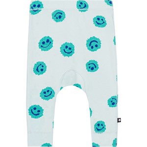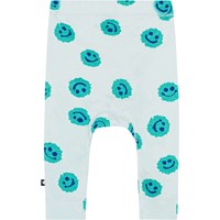 Light blue leggings for small children in organic cotton. The snug fitting leggings have an elastic waist. They are comfortable and easy to move around in, with room for a nappy. They are in an all over print of turquoise pom poms with dark blue smiling faces.