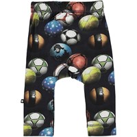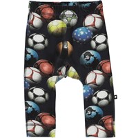 Seb is a pair of baby trousers with a print of colourful footballs. They have an elastic waist and narrow legs.