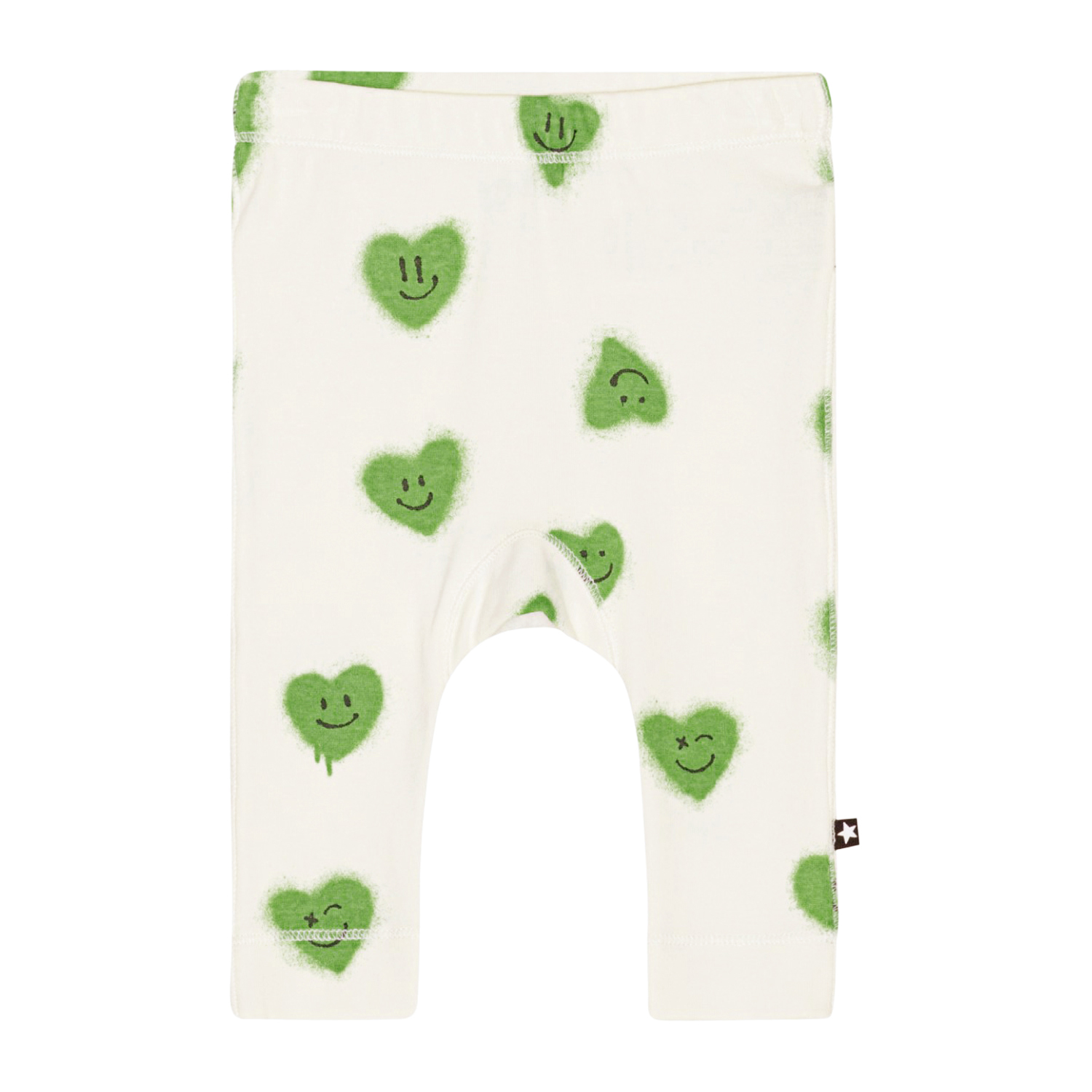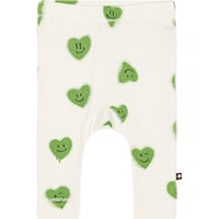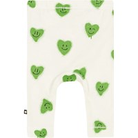 Light green leggings for small children in organic cotton. The snug fitting leggings have an elastic waist. They are comfortable and easy to move around in, with room for a nappy. They are in an all over print of green hearts with smiling faces.