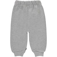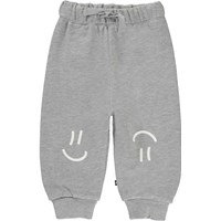 Simeon is a pair grey baby sweatpants with a print of smiley faces on the legs. They have an elastic waist with ties.