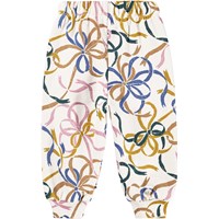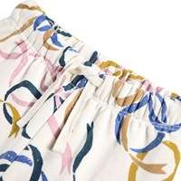 Soft pants for the little ones made of organic cotton. The pants are off-white with a print of colourful bows. The pants have elastic and a tie at the waist and ribbed cuffs at the ankles. They are easy to put on and take off and have plenty of space to move. Combine it with the matching sweatshirt for a complete outfit.