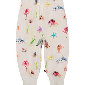 Sand coloured sweatpants for small children in organic cotton. They have elastic with a drawstring at the waist and rib at the legs. They are comfortable and easy to pull on and move around in. The sweatpants are in a print of colourful crabs, snails and sea plants. Combine the trousers with matching jumper for a complete sweatsuit set.