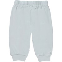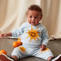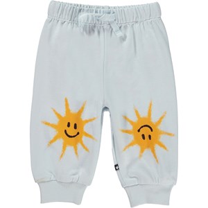 Simeon is a pair of light blue baby sweatpants with a print of happy suns on the legs. They have an elastic waist with ties.
