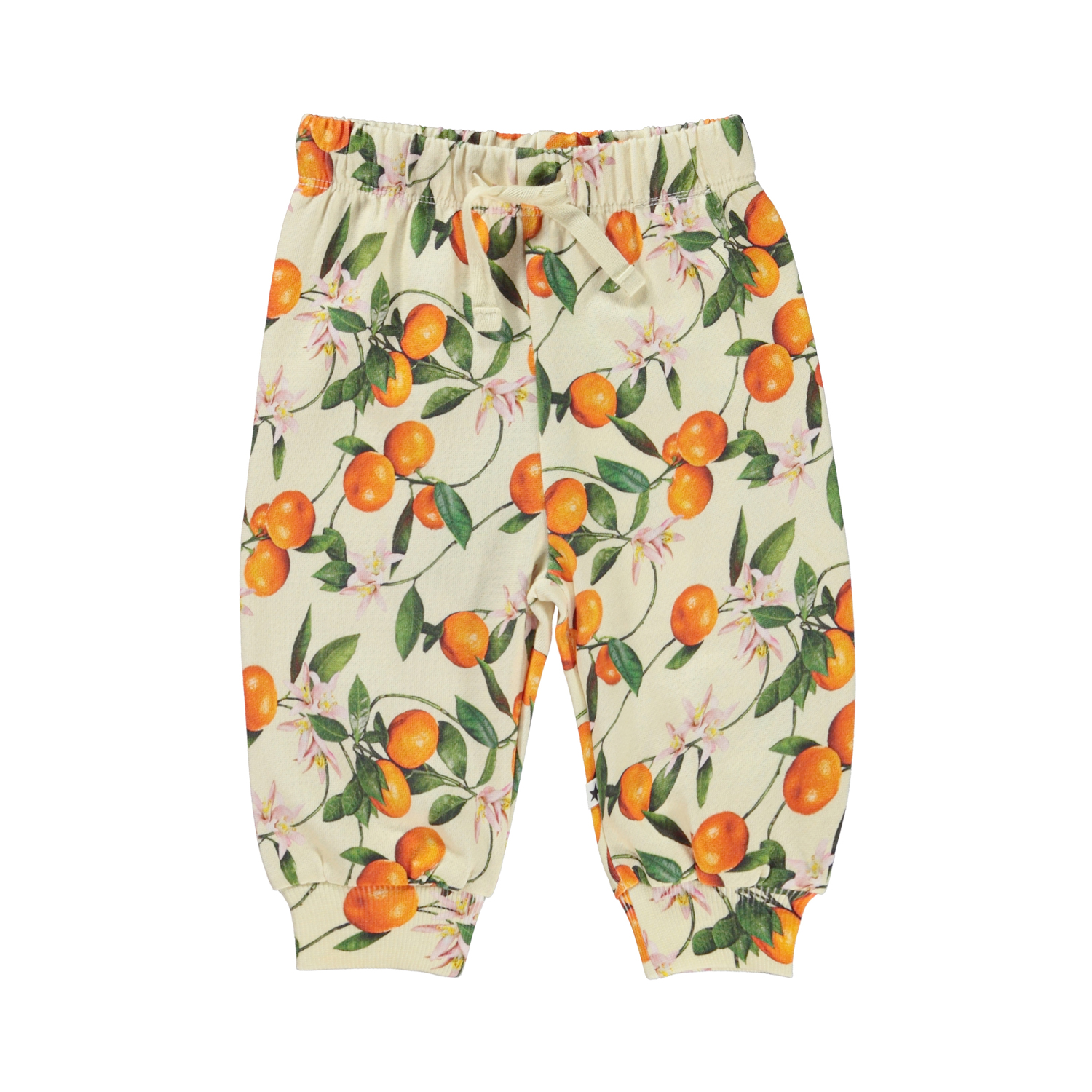 Simeon is a pair of light coloured baby sweatpants with a mandarin orange print. They have an elastic waist with ties.