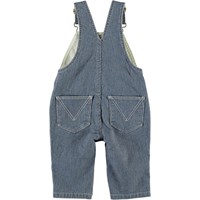 Sky is a pair of baby dungarees in blue with narrow white stripes. They have a button closure at the sides and adjustable straps.