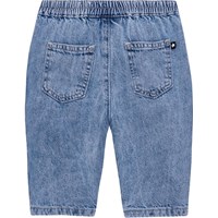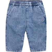 Blue, lightweight trousers in a washed cotton and viscose blend. They are in a loose fit and have an elastic waist with a drawstring for a secure, comfortable fit. They are lightweight and airy, and they have a small smiling face embroidery on the pocket. You can wear them with the matching shirt for a complete summer set.