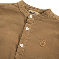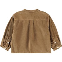 Brown velvet shirt for the little ones made of organic cotton. The shirt has a mandarin collar and a button placket with three white buttons. The loose fit makes it comfortable to wear and easy to put on and take off. On the chest, there is a little pink smiling face embroidered. Combine it with the matching pants or shorts for a complete outfit.