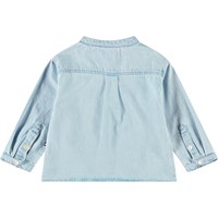 Light blue denim shirt for the little ones in organic cotton. The shirt features a mandarin collar and button placket with three white buttons. The loose fit makes it comfortable to wear and easy to put on and take off. On the chest, there is a small smiling face embroidered in light blue. Pair with the matching trousers or shorts for a complete outfit.