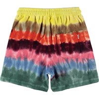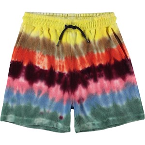 Abay is a pair of terry shorts with rainbow stripes. The shorts have a loose fit with pockets at the sides and an elastic waist with ties. Wear them with a matching polo.
