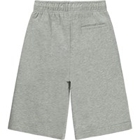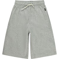 Add is a pair of light grey, unisex shorts that are long and have a drawstring at the waist.