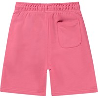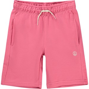 Adian is a pair of unisex shorts in pink with an embroidered peace sign on one pocket. The shorts have a light coloured drawstring at the waist.