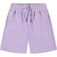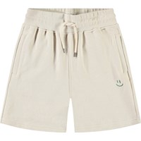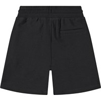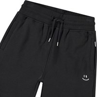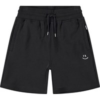 Black baggy shorts in soft organic cotton. The shorts have a loose fit with a wide elastic waistband and drawstring, making them easy to adjust and comfortable to wear. They have pockets in the side seam and a single back pocket. On the front, there is a small white smiling face embroidery.
