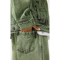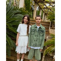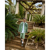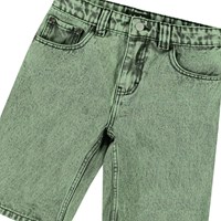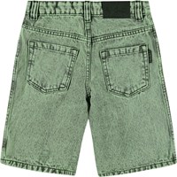 Green knee-length denim shorts in organic cotton. The shorts have pockets at the front and back, a snap button and zip at the front, as well as belt loops. From size 92-134, the shorts have an internal button for adjusting the waist to ensure an optimal fit and longer wear. The shorts have a washed look in green and black.