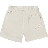 Simms is a pair of soft baby shorts in off-white with a print of a banana on one leg. The shorts have an elastic waist with ties and a single back pocket.