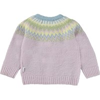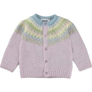 Light purple knit cardigan with a pastel coloured, nordic inspired print at the neck and shoulders. This cardigan is in a lovely alpaca wool blend, which makes it perfect for colder days. Wear the cardigan with the Signy trousers in the same quality for the perfect set.