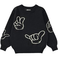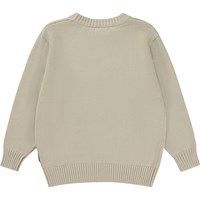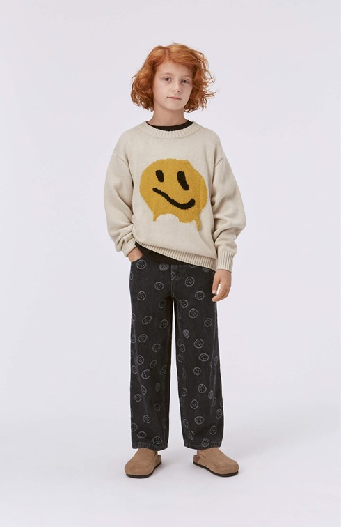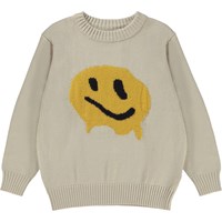 Off-white knit jumper with a yellow, smiling computer glitch face. It;s a different, fun take on the traditional smiley face. This knit jumper is in a cotton/wool blend and has long sleeves, a round neck with rib as well as rib at the sleeves and bottom. This jumper is in a loose fit.
