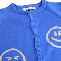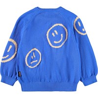 Blue knitted cardigan for the little ones made organic cotton of with fun figures. The cardigan has raglan sleeves, ribbed edges, and a round neckline.