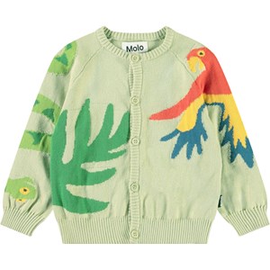Knitted cardigan for the little ones in organic cotton. The cardigan features raglan sleeves, ribbed edges, and a round neckline. The cardigan is green with a jungle theme. Pair with the matching trousers for a complete outfit.