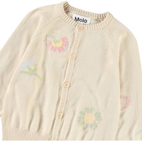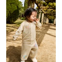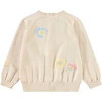 Knitted cardigan for the little ones in organic cotton. The cardigan features raglan sleeves, ribbed edges, and a round neckline. The cardigan is beige with flowers on it. Pair with the matching trousers for a complete outfit.