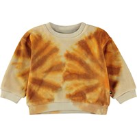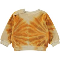 Orange sweatshirt for small children with a tie-dye placement print. The print has two suns in shades of orange, one on each side. The sweatshirt is in 100% cotton, has a round neck with a rib edge, raglan sleeves with rib and rib at the bottom. The sweatshirt has an easy snap closure at the neck. Wear it with the Simeon joggers for the perfect set.