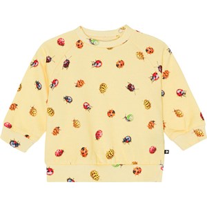 Yellow sweater for small children in organic cotton jersey. The jumper has rib at the sleeves, neck and bottom. The neck has an easy, two-snap closure. The trouser has alloverprint with cute colorful ladybugs and snails. You can wear this style with the matching trousers for a complete, soft jersey set.