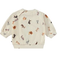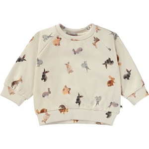Off-white sweatshirt for small children in an all over print of small, sweet and curious bunnies that are jumping around, exploring the world. This sweatshirt is in 100% cotton, and it has a round neck with a rib edge and rib at the sleeves and bottom. It has an easy snap closure at the neck. Wear the sweatshirt with the Simeon joggers in the "Animal Living" print for the perfect look.
