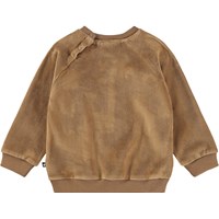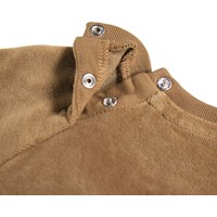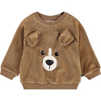 Brown sweatshirt for the little ones made of soft organic cotton with a dog face on the front. The sweatshirt has raglan sleeves, ribbed edges around the waist and sleeves and a round neckline with two snap buttons at the back to make it easy to put on and take off. Combine it with the matching pants for a complete set.