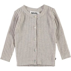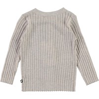 Georgette is a grey baby knit cardigan. It has a round neck and a button closure on the front.