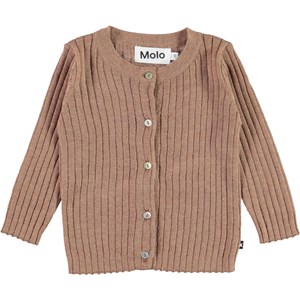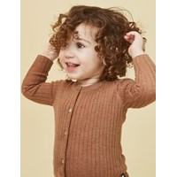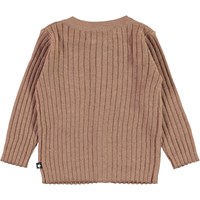 Georgette is a brown baby knit cardigan. It has a round neck and a button closure on the front.
