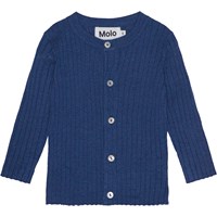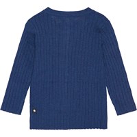 Dark blue cardigan for small children in a delicate rib knit. This cardigan is in a soft cashmere/viscose blend, has a round neck. long sleeves and small mother of pearl colourd buttons on the front. Wear the cardigan with the Shadow trousers in the same quality for the perfect set that is soft and warm.