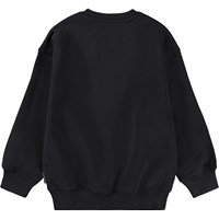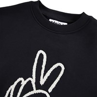 Black sweatshirt made of soft organic cotton with a large print of a hand-drawn peace sign. The sweatshirt has an oversized fit with ribbed edges around the neck, sleeves and waist.