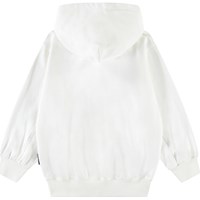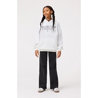 White oversized hoodie in soft organic cotton with a pouch pocket and ribbed edges. The hoodie features the text 'Future' on the front, written with sparkling rhinestones.