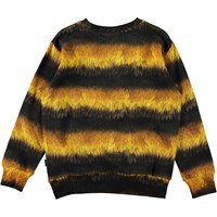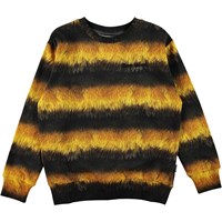 Mik is a black and yellow striped sweatshirt that looks like a bee with the text 'Bee nice' on the chest.