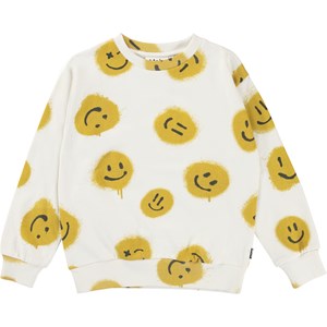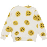Mik is a white sweatshirt in an all over print of yellow spray painted smiley faces. Mik has rib at the neck, sleeves and waist.
