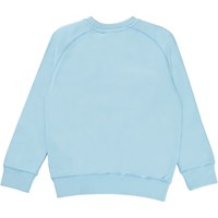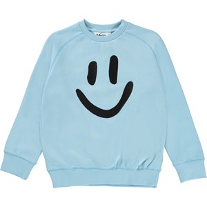Mike is a blue unisex sweatshirt with a print of a smiley face on the front.