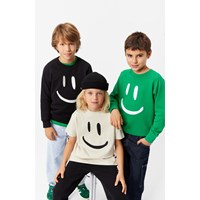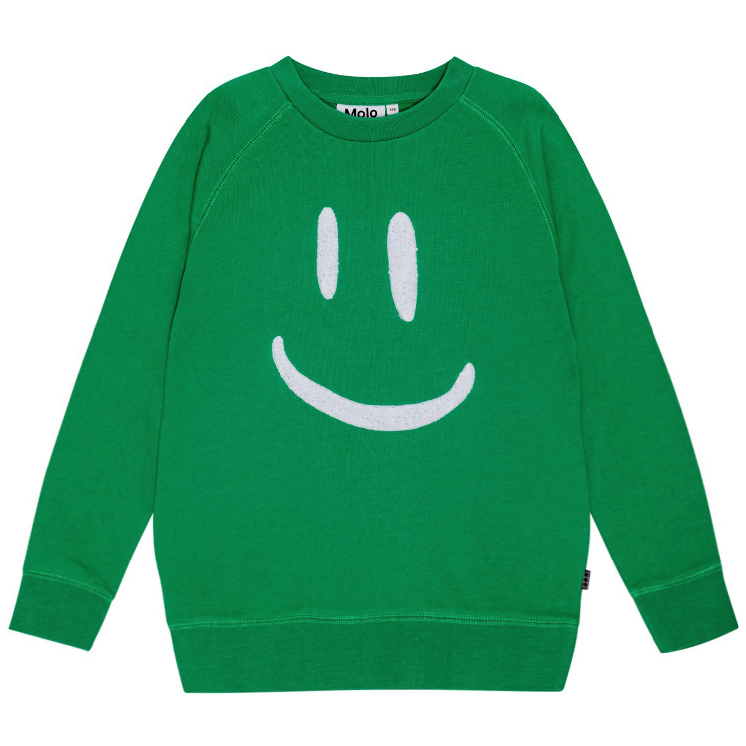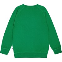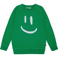 Molo's Plan International green sweatshirt is made from organic cotton. It has a round neckline, raglan sleeves, and rib cuffs on the sleeves and hem. The sweatshirt has a loose fit and a large white embroidered smile on the front. It also has a brushed inner face, making it soft and warm to wear. Read more about Molo X Plan International here.