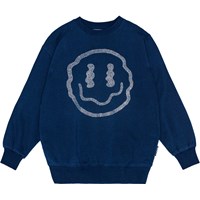 Dark blue sweatshirt in organic cotton with a brushed inner face, making it soft and warm to wear. The sweatshirt has a loose fit, a round neckline, rib edges, and artwork featuring a smiling face in sequins on the front, which sparkles and shimmers.