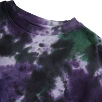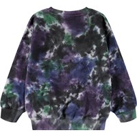 Cool sweatshirt made of soft organic cotton with a tie-dye print in black, purple, green, and blue. The sweatshirt has ribbed edges around the neck, sleeves and waist. The sweatshirt has a loose fit. All our tie-dye is handmade what creates a unique pattern that varies from style to style.